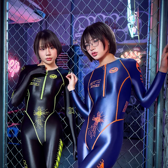The foundation of the Neoskin Ver. 1 ‘Wanderer in Space’ is our signature satin spandex, a smooth, high-gloss performance fabric engineered for precision fit and movement. It combines a luxurious satin sheen with a soft interior and powerful 4-way stretch, molding perfectly to the body while maintaining resilience. The material’s reflective finish creates that unmistakable second-skin look: sleek, fluid, and futuristic.